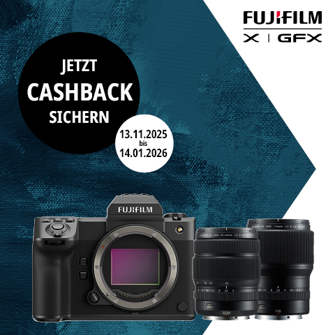 Kunden, die ein teilnahmeberechtigtes FUJIFILM GFX Gehäuse oder ein teilnahmeberechtigtes FUJINON GF Objektiv („Teilnahmeberechtigte Produkte“) im Aktionszeitraum 13. November 2025 bis 14. Januar 2026 erwerben, können eine Cashback-Auszahlung beantragen.