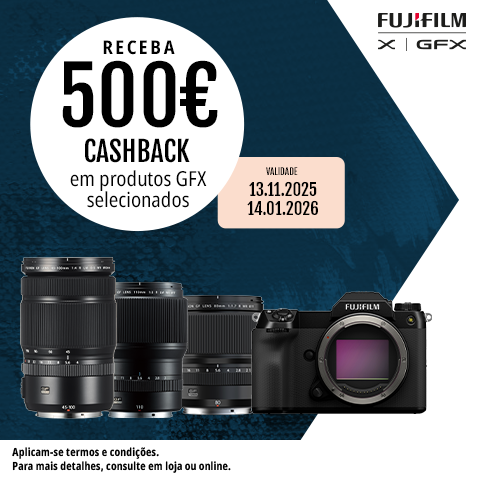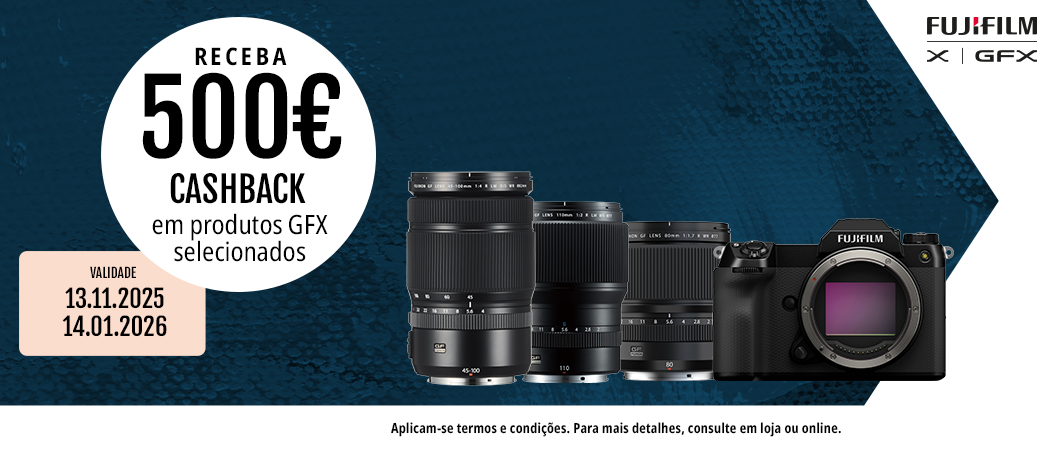 Os clientes que adquirirem uma NOVA objetiva FUJIFILM GFX ou Série X qualificada (“Produtos Qualificados”) entre 13 de novembro de 2025 e 14 de janeiro de 2026 (“Período Promocional”) serão elegíveis para a promoção. Produtos FUJIFILM usados ou recondicionados estão excluídos desta promoção.